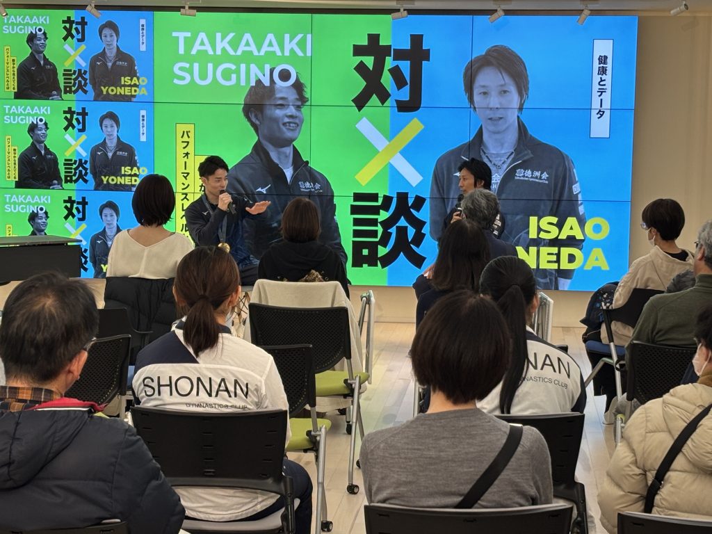 また、徳洲会体操クラブの⽶⽥ 功監督(2004 年アテネ五輪・団体総合:⾦メダル、個⼈鉄棒:銅メダル)と杉野 正尭選⼿(2024 年パリ五輪・団体総合:⾦メダル)による「健康とデータ」をテーマにした対談も行われ、データを活用した科学的な視点からの体操練習やケガからの復帰プロセス、さらには一人一人の個性を活かす組織運営方法への適用事例等を紹介頂きました。